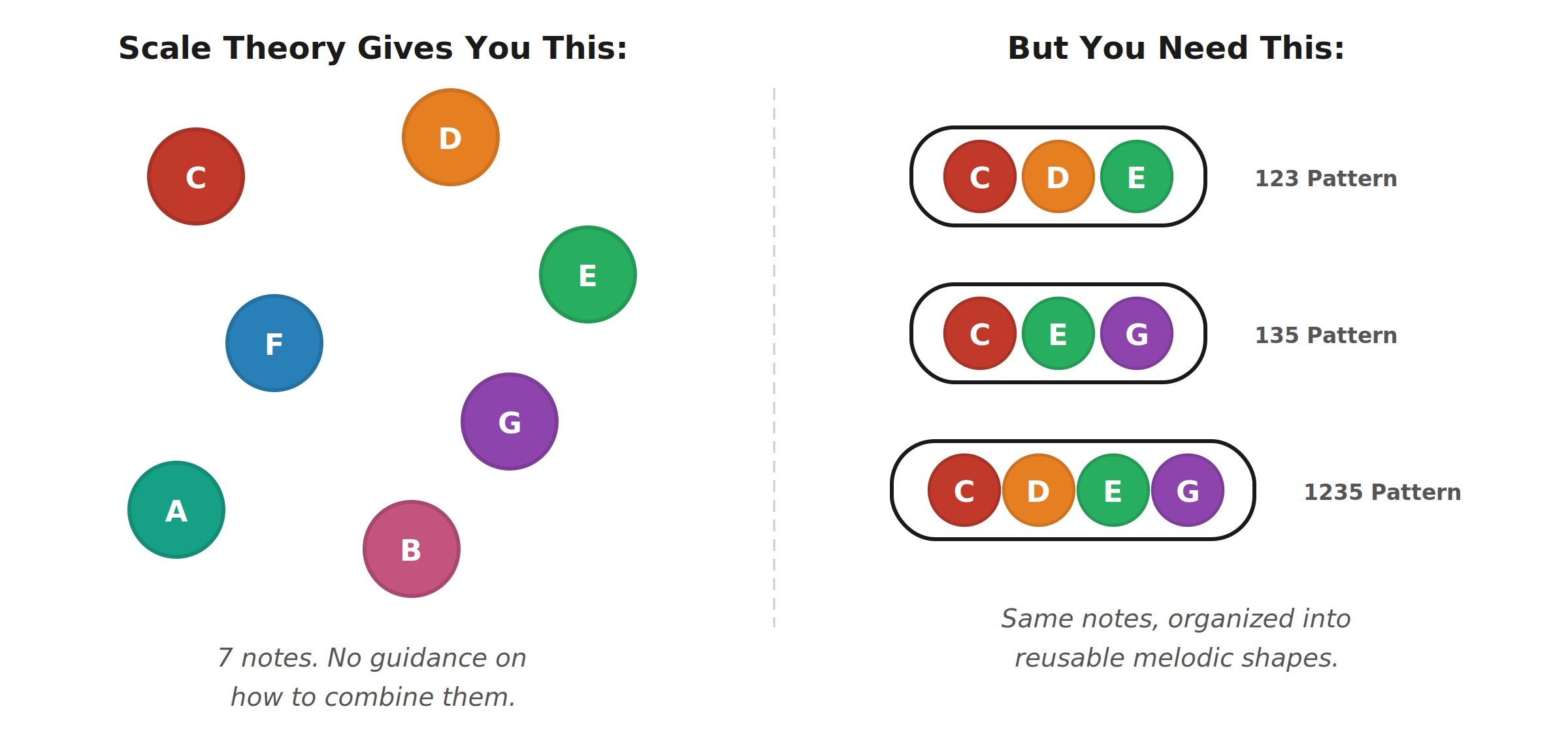 This conscious selection means you're always a fraction behind the music. You're reacting to the harmony rather than flowing with it. And because you're choosing, you tend to reach for what's comfortable and familiar rather than what the music is calling for in the moment.